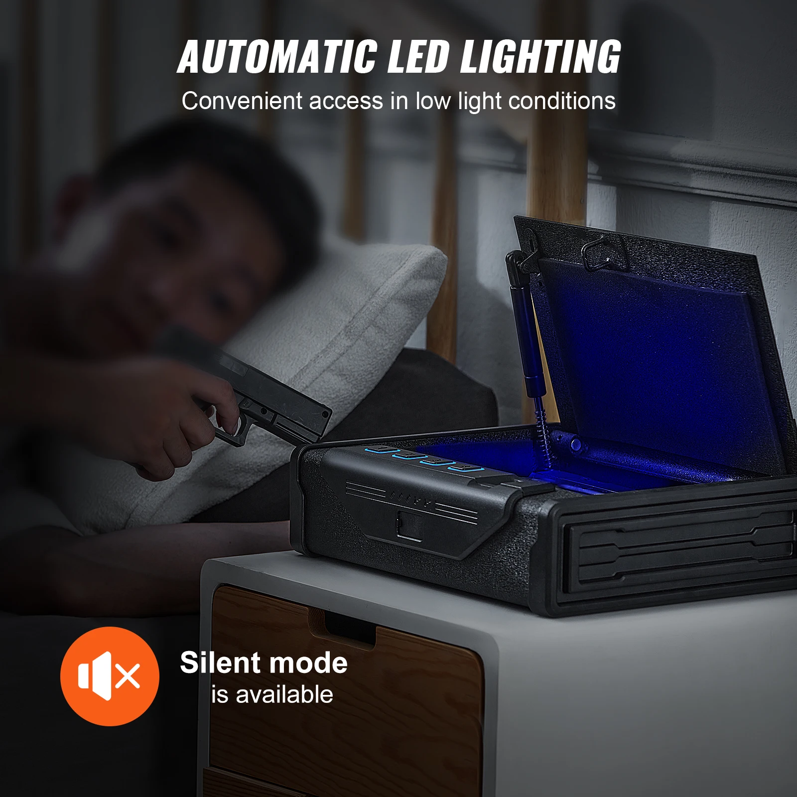Luz LED y modo silencioso: diseñada pensando en sus necesidades, nuestra caja para armas de fuego incluye iluminación LED para un fácil acceso durante la noche.El modo silencioso te permite recuperar discretamente tus pertenencias sin molestar a los demás.